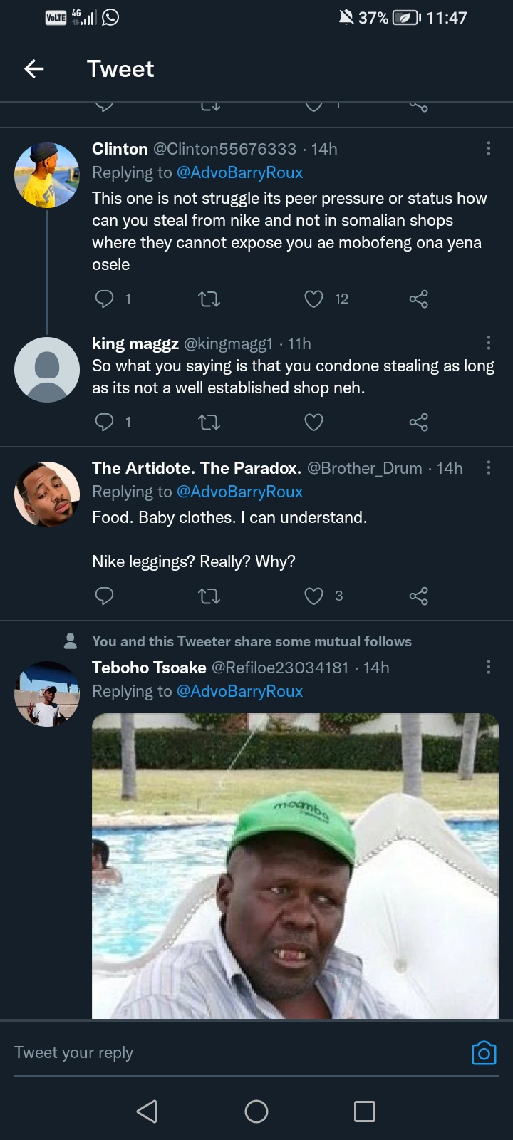“This one is not struggling, its peer pressure or status. how can you steal from a nike shop and not in Somalian shop” replied @Clinton55676333?
