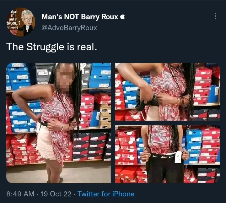 “The struggle is real” captioned the young man. In these pictures, the young lady seems to have stolen leggings from a certain shop.