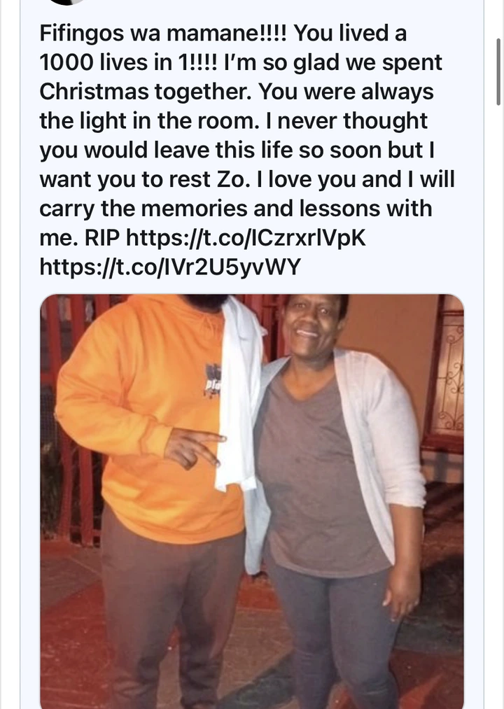 “Today I paid my respects at the funeral of my beloved aunt. Things are moving along in my life a little faster than I had planned. It’s simply not doable. Calm will come to you as you sleep, Zo. I’ve been crying like a baby all day today. Sorry about cancer, but I love you a lot. The creator of this work is Cassper Nyovest.