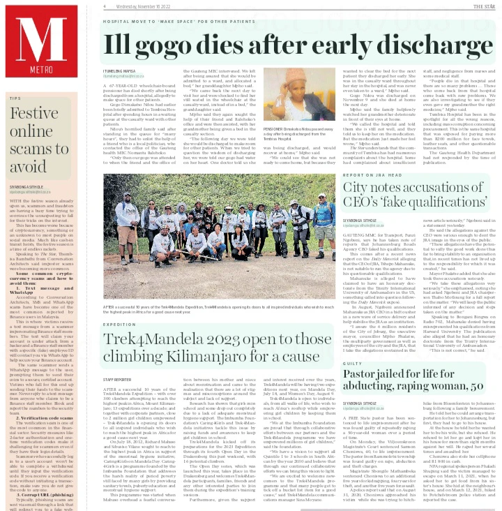 “Only then our gogo was attended to when the friend and the office of the Gauteng MEC intervened. We left after being assured that she would be admitted to a ward, and allocated a bed,” her granddaughter Mpho said.