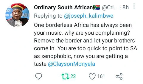 He discussed Africa having no boundaries to get preferences and supporters on Twitter, yet well that is an issue. They will open the line to his siblings in Zambia. It is too early to call South Africa xenophobic as we grieve day to day the predicament of unlawful workers. He is a similar individual who taught wrongdoing and statelessness is presently an issue since he is selling his own medication. Source:
