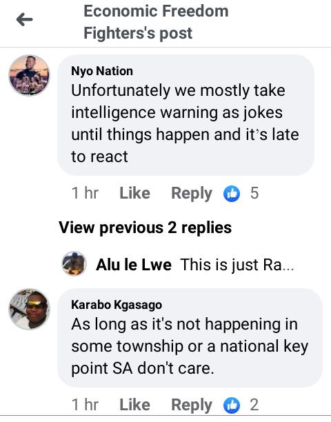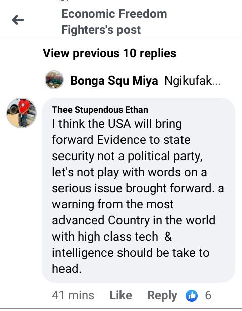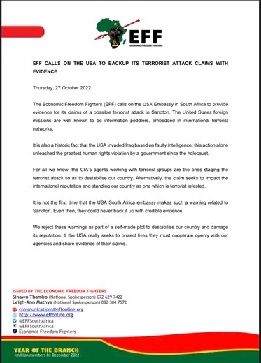 The EFF has called upon the USA, to reveal evidence behind their claims of terrorist attack. This comes right after U.S intelligence cautioned South Africa against possible attack.