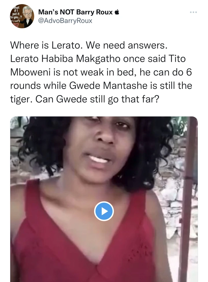 @AdvoBarryRoux took to Twitter to reshape this controversial video. He captioned the tweet, “Where is Lerato. We need answers. Lerato Habiba Makgatho once said Tito Mboweni is not weak in bed, he can do 6 rounds while Gwede Mantashe is still the tiger. Can Gwede still go that far?”
