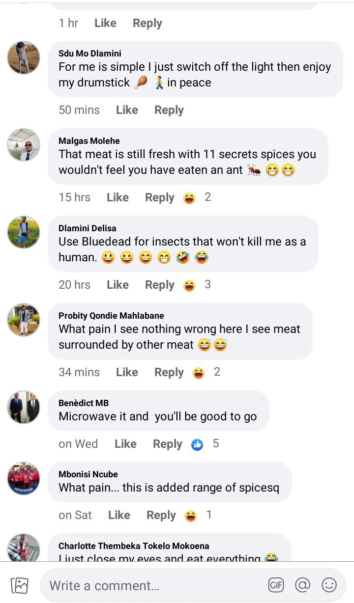 ” That meat is still fresh with 11 secrets spices you wouldn’t feel you have eaten an ant”.